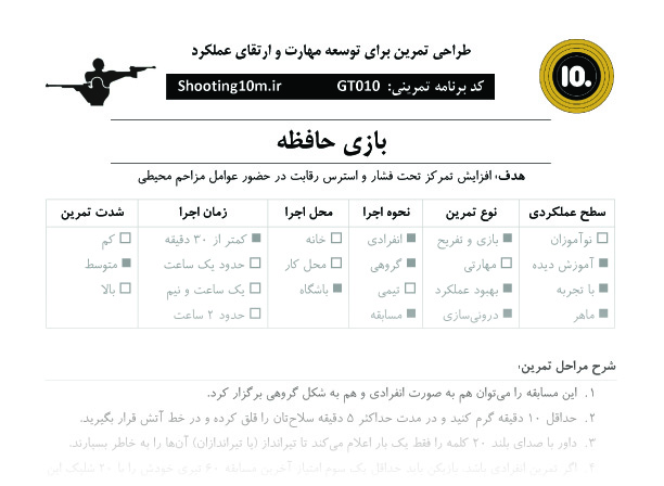 برنامه بازی تمرینی کد GT010 با عنوان بازی حافظه یک طرح تمرینی است که با هدف افزایش تمرکز تحت فشار و استرس رقابت در حضور عوامل مزاحم محیطی طراحی شده است. ویژگی های این طرح تمرینی را میتوانید در تصویر پیش نمایش محصول مشاهده کنید.