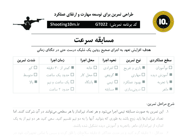 برنامه بازی تمرینی کد GT022 با عنوان مسابقه سرعت یک طرح تمرینی است که با هدف افزایش تعهد به اجرای صحیح روتین یک شلیک درست حتی در تنگنای زمانی طراحی شده است. ویژگی های این طرح تمرینی را میتوانید در تصویر پیش نمایش محصول مشاهده کنید.