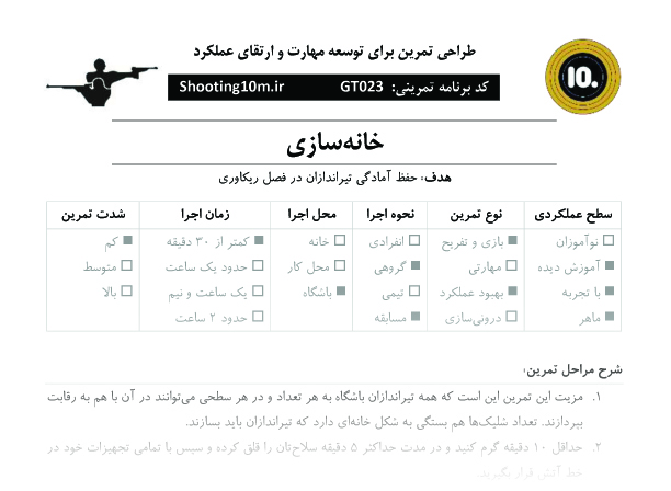 برنامه بازی تمرینی کد GT023 با عنوان خانه سازی یک طرح تمرینی است که با هدف حفظ آمادگی تیراندازان در فصل ریکاوری طراحی شده است. ویژگی های این طرح تمرینی را میتوانید در تصویر پیش نمایش محصول مشاهده کنید.